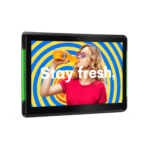 10 point PCAP touch, VESA mounting, no integrated battery – longer life, 48V passive PoE, integrated camera, coloured LED frame