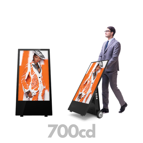 IP65 rated, 27 hour battery life, fully portable – integrated castors, ambient light sensor, anti-glare tempered glass front